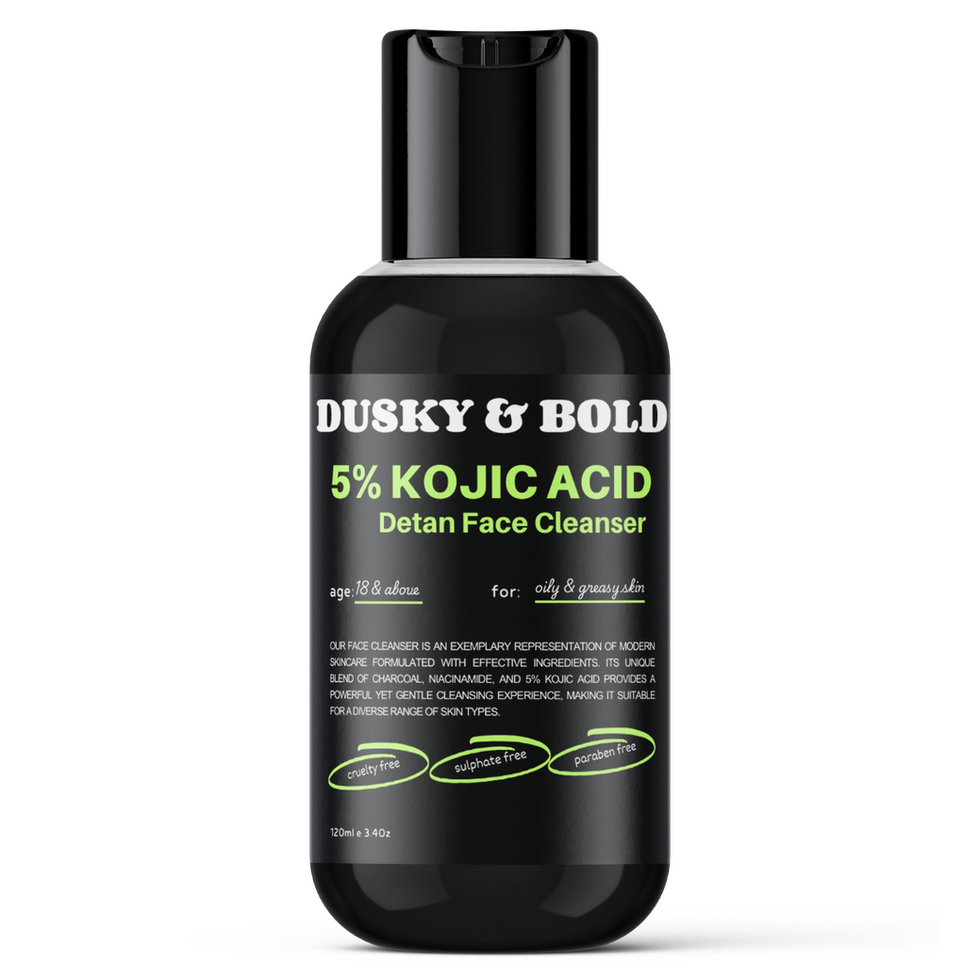 Introducing the Dusky and Bold 5% Kojic Acid Detan Face Wash with Charcoal, Black Rice & Niacinamide, specifically crafted for the modern man who seeks an effective solution for pigmentation and dark spots. This premium face wash for men and women is designed to cater to those with oily and acne-prone skin, offering a gentle yet profoundly effective cleansing experience. With its deep pore cleansing formula, it targets dirt and pollution, providing a fresh start to your skincare routine. The Dusky and Bold facewash for oily skin harnesses the power of natural ingredients such as charcoal and black rice, known for their ability to absorb excess oil and impurities while promoting a clean complexion. Charcoal acts as a magnet, drawing out dirt and toxins from the skin, while black rice offers antioxidant properties, fighting against environmental stressors. This potent combination ensures your skin remains clear and invigorated. Niacinamide is a star component of this face wash for oily and acne-prone skin. It helps to clean pores, reduce inflammation, and diminish the appearance of blemishes and dark spots. The inclusion of 5% kojic acid further enhances the tan removal face wash capabilities , making it an ideal choice for those struggling with pigmentation issues. Unlike other products, the Dusky and Bold face wash provides a comprehensive solution tailored specifically for men. Its gentle formulation ensures it's suitable for daily use and does not strip the skin of its essential moisture, making it a top choice for those with greasy and oily skin. This detan face wash is not just a cleanser; it's a complete skincare experience. It effectively combats blemishes and unclogs pores, offering a fresh and clean feel with every wash. Embrace the Dusky and Bold face wash and transform your skincare routine, achieving a complexion that's not only clean but also visibly brighter and healthier. Experience the difference with Nina Dorada, where every wash is a step towards flawless skin.